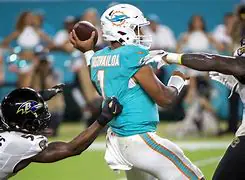 For the last 711 occasions when a team was trailing by 21 points in the fourth quarter, they lost the game.  The Miami Dolphins were team #712 to have that distinction yesterday afternoon.  But thanks to the ascension of Tua Tagovailoa to standout quarterback, buoyed by a one-two punch of receivers in Tyreek Hill and James Waddle that is perhaps unmatched by any other team, Miami roared back and kayoed the Baltimore Ravens (and their own top-notch quaerterback Lamar Jackson) 42-38, moving to an wholly unexpected 2-0.  All Tua did was throw for 199 of his 469 yards in the last 15 minutes as well as three of six touchdowns.  The only other Dolphin quarterbacks in their history to throw for six touchdowns in a game were Dan Marino and Bob Griese.  They’re the only Dolphins who have quarterbacked them in a Super Bowl.