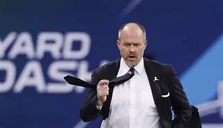 This year, after a one-year gap for COVID, the Combines have returned, and so too has Eisen’s quest to shatter the 6 second barrier on the field in Indy (Last year, he used the empty field across from his new offices at SoFi Stadium). Since 2005, when challenged by Broncos running back Terrell Davis, he has regularly taken his own turn at the 40-yard dash that has emerged as the premier event in this talent competition. To make things even more challenging, Eisen does his sprint in a suit and tie.