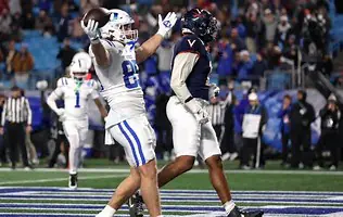 Darian Mensah hit Jeremiah Hasley for a 1-yard touchdown strike on fourth-and-goal to begin the overtime period. The Blue Devils’ quarterback was rolling out and running for his life when he found Hasley standing wide open in the end zone. Luke Mergott intercepted Virginia quarterback Chandler Morris on the first play of Virginia’s overtime possession to end a wild game.
