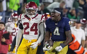 Powered by its tremendous running back duo, No. 13 Notre Dame beat No. 20 USC 34-24 on Saturday to clear one of the most significant hurdles on its path to a return trip to the College Football Playoff.