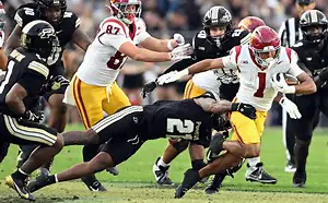 After a three-hour and fifteen-minute weather delay to begin the game, the USC Trojans outlasted the Purdue Boilermakers 33-17 with its defense stepping up when it mattered the most in its Big Ten opener. USC’s defense was the difference in the game, as they recorded three interceptions off Purdue starting quarterback Ryan Browne, one of which featured a big man touchdown, a favorite among college football fans. The 6-foot-5, 360-pound defensive tackle, Jamaal Jarrett, recorded a 70-yard interception return late in the third quarter for the Trojans.