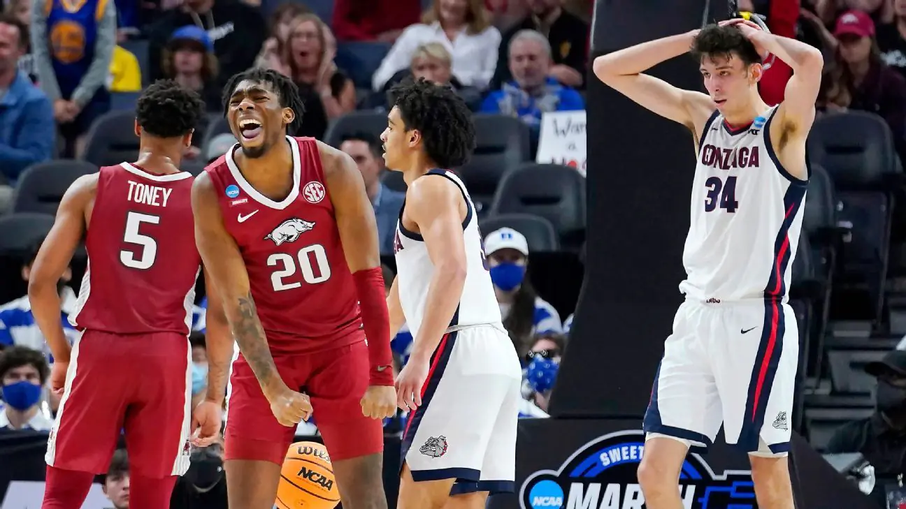 The earlier games, starting at 4 PM pacific, were both close early on, with 11 seed Michigan playing Villanova close on TBS before fading in the end (sorry, my many friends who hail to the conquering heroes) while on CBS top seed Gonzaga was in trouble with tenacious Arkansas. The Zags are a particularly star-crossed school. For the last two years, they have been favored to win it all, blessed with both a cakewalk conference that assures that they will have an imposing regular season record and, this go-round, a tremendously talented freshman big man, 7-foot NBA prospect Chet Holmgren. Last year, they made it through to the championship game, surviving a thrilling overtime semifinal against a UCLA team that was seeking to be the first First Four team to advance to a seventh post-season contest before running into a physical Baylor team that ended their dreams. This year their come-uppance came at the hands of the even more scrappy Hogs, coached by NBA veteran (and second-generation head coach) Eric Musselman.A team that was averaging over 52 per cent field goal percentage and nearly 88 points per game shot under 40 per cent and scored 20 points below that average. For the second consecutive year, Musselman and the Razorbacks will advance to the Elite Eight.