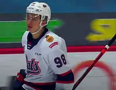 In the team’s second group stage game against Team Germany, Bedard scored a hat trick and four primary assists, equaling a record held by four other players for most points for Canada in a single World Junior game. His three goals moved him to twelve at the World Junior championships, within two of Jordan Eberle‘s Canadian record.[46] The following day he scored two goals against Team Austria, tying the record.[47] Scoring the opening goal in the quarter-final match against Team Slovakia gave Bedard sole possession of the goalscoring record, simultaneously breaking Eric Lindros‘ 30-year-old Canadian record for most World Junior points. He also set a new world record for World Junior points by a player under the age of 19, previously held by Czech player Jaromír Jágr.[48][49] With the game tied 3–3 at the end of regulation, Bedard won the game in overtime after stickhandling through all three Slovak players and around goaltender Adam Gajan, a sequence hailed as an “indelible stamp” on the tournament.[50][51] He recorded nine goals and fourteen assists during the seven-game tournament, winning gold with Team Canada for the second consecutive year.[52] Bedard was named the championships’ best forward by the IIHF directorate, as well as to the media all-star team and as the most valuable player of the event.[53][54].