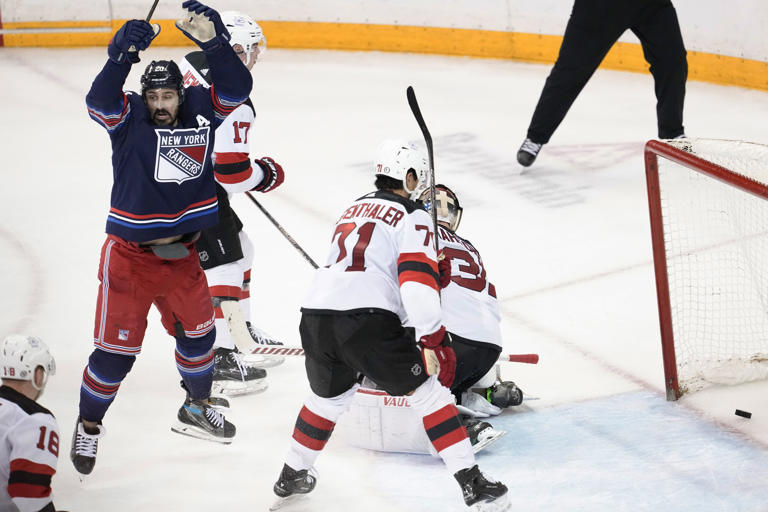 Chris Kreider scored a power-play goal late in the third period and the New York Rangers rallied to beat the New Jersey Devils 4-3 on Wednesday night in a game that started with a 10-player brawl.
